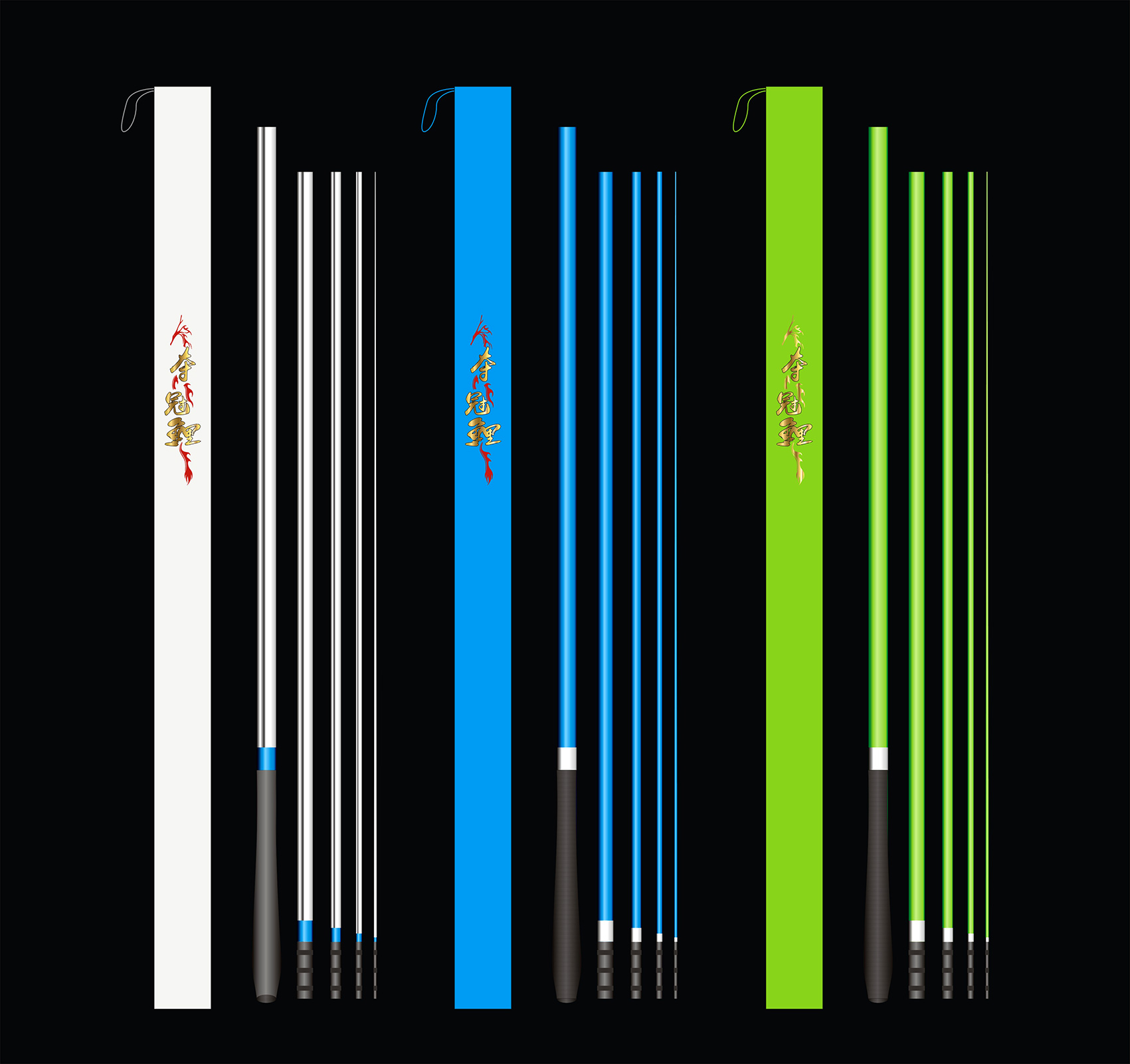 我想象中,這三款魚竿,采用電鍍漆的工藝,拿在手上噌亮的感覺,應該很好,包括竿架和抄網,做成一個系列,