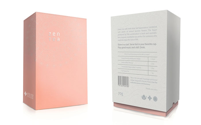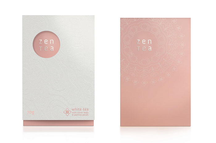 看看這美麗的茶包裝。我們喜歡在外套筒上的一個禪宗花園的微妙質地。一旦撕開它,你看到一個散熱墊模式從標志類型。色彩柔和的調色板反映了設計師想要傳達的寧靜。