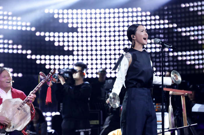 在本期節目譚維維所演唱的原創歌曲《給你一點顏色》顛覆了搖滾樂固有形式,請來五位老人演奏樂器,將小眾戲曲曲種“華陰老腔”搬上主流舞臺,為自己的”譚式搖滾“注入新鮮元素,席地而坐的老人用板凳、梆子、六角形月琴為樂器,而譚維維則手持鑼鼓,帥氣獻唱。